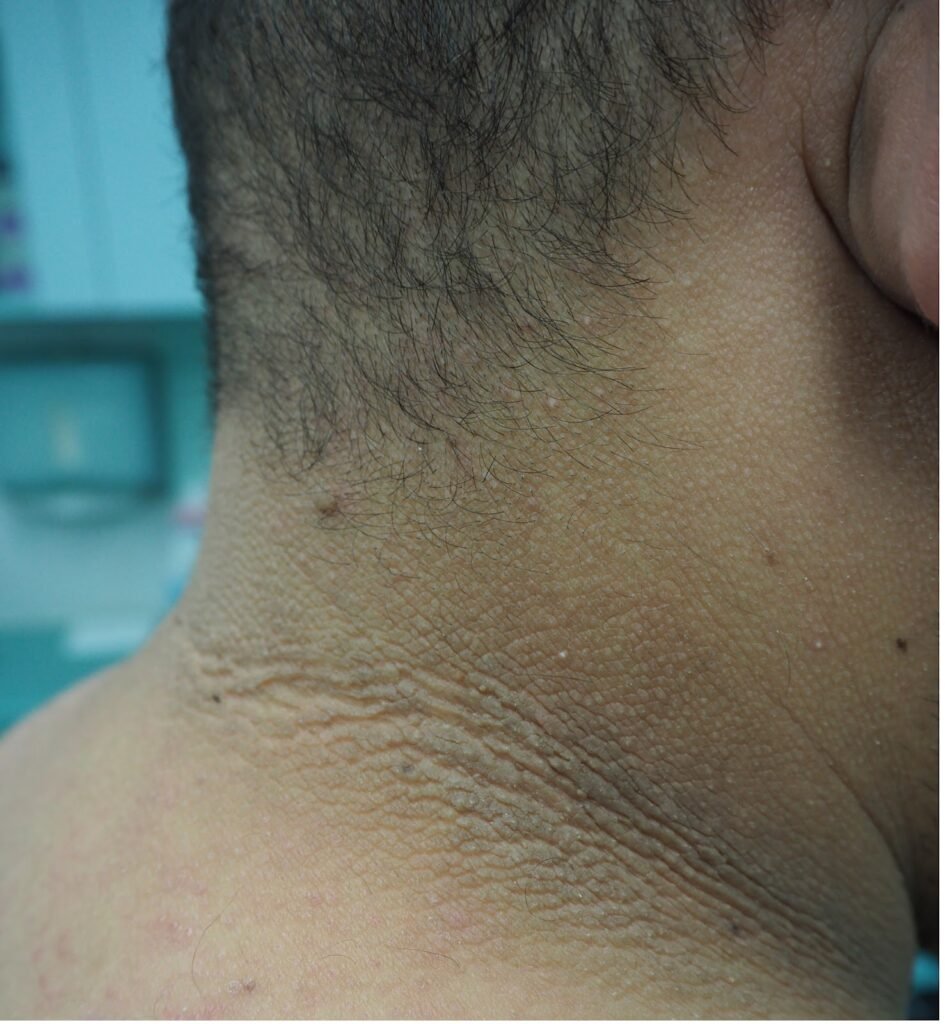 - Acanthosis nigricans (darkened skin folds)